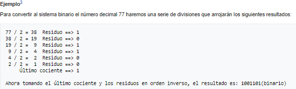 Se divide el número del sistema decimal entre 2, cuyo resultado entero se vuelve a dividir entre 2, y así sucesivamente hasta que el dividendo sea menor que el divisor, 2. Es decir, cuando el número a dividir sea 1 finaliza la división.