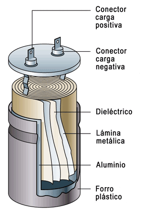 En su estado natural cada una de las placas internas tiene el mismo numero de electrones. Cuando conectamos una fuente de voltaje una de las placas pierde electrones (siendo esta la terminal positiva), mientras que la otra los gana ( terminal negativa). Este movimiento de electrones se detiene cuando el capacitor alcanza el mismo voltaje que la fuente de alimentación.